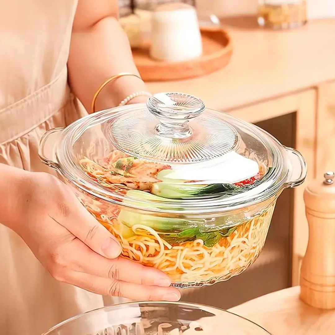 Su diseño circular transparente no solo es aesthetic, sino que también es 100% práctico: puedes supervisar la cocción fácilmente. Las asas son anchas para un agarre firme y seguro, facilitando el transporte de tus creaciones calientes desde el horno hasta la mesa. Además, incluye una tapa con perilla para un levantamiento sencillo y limpio, perfecta para el servicio y el almacenamiento posterior.